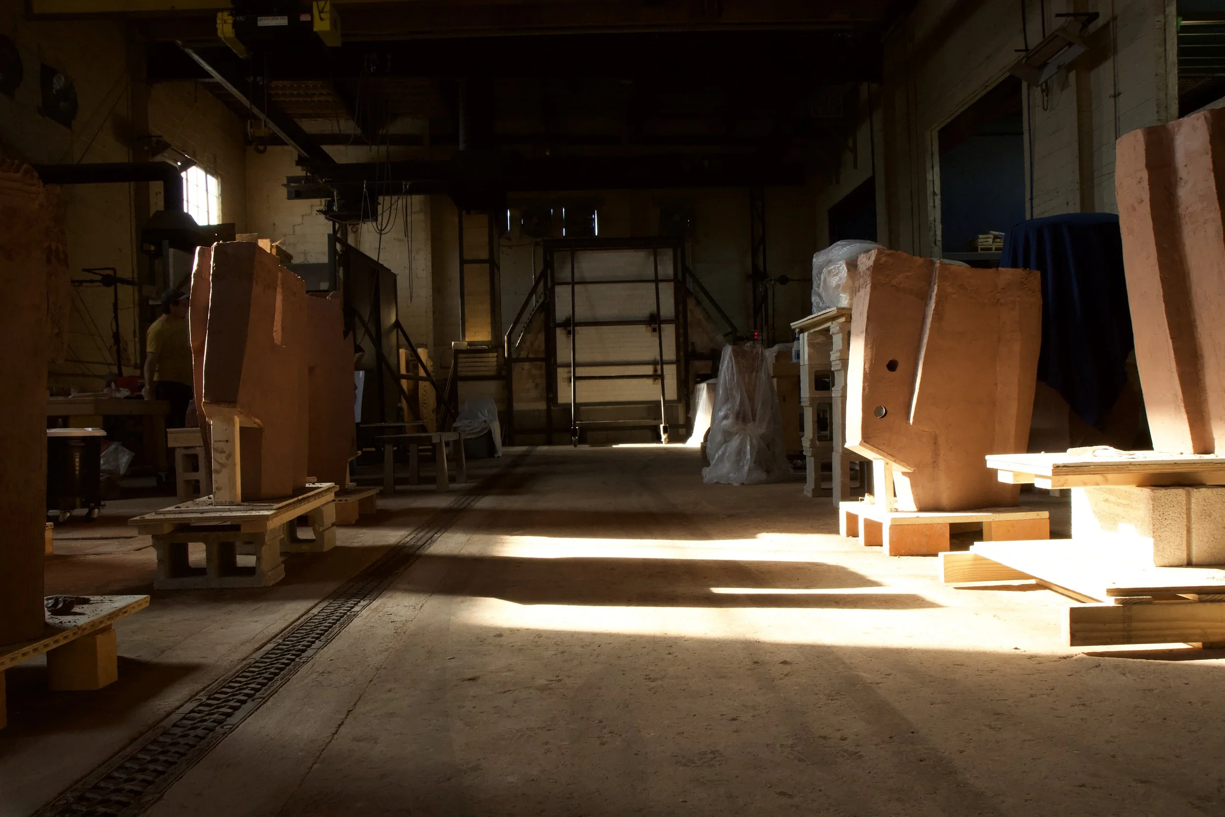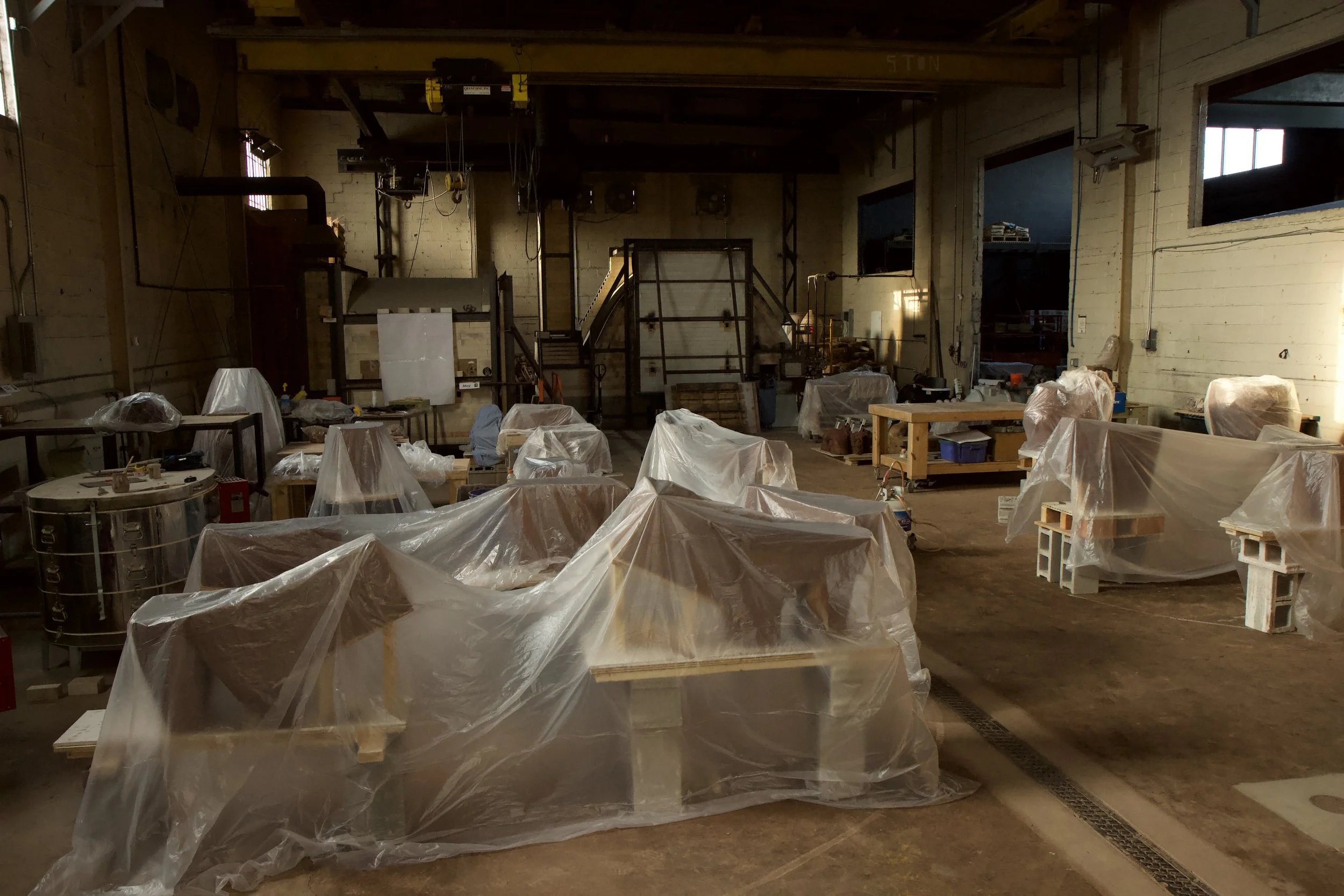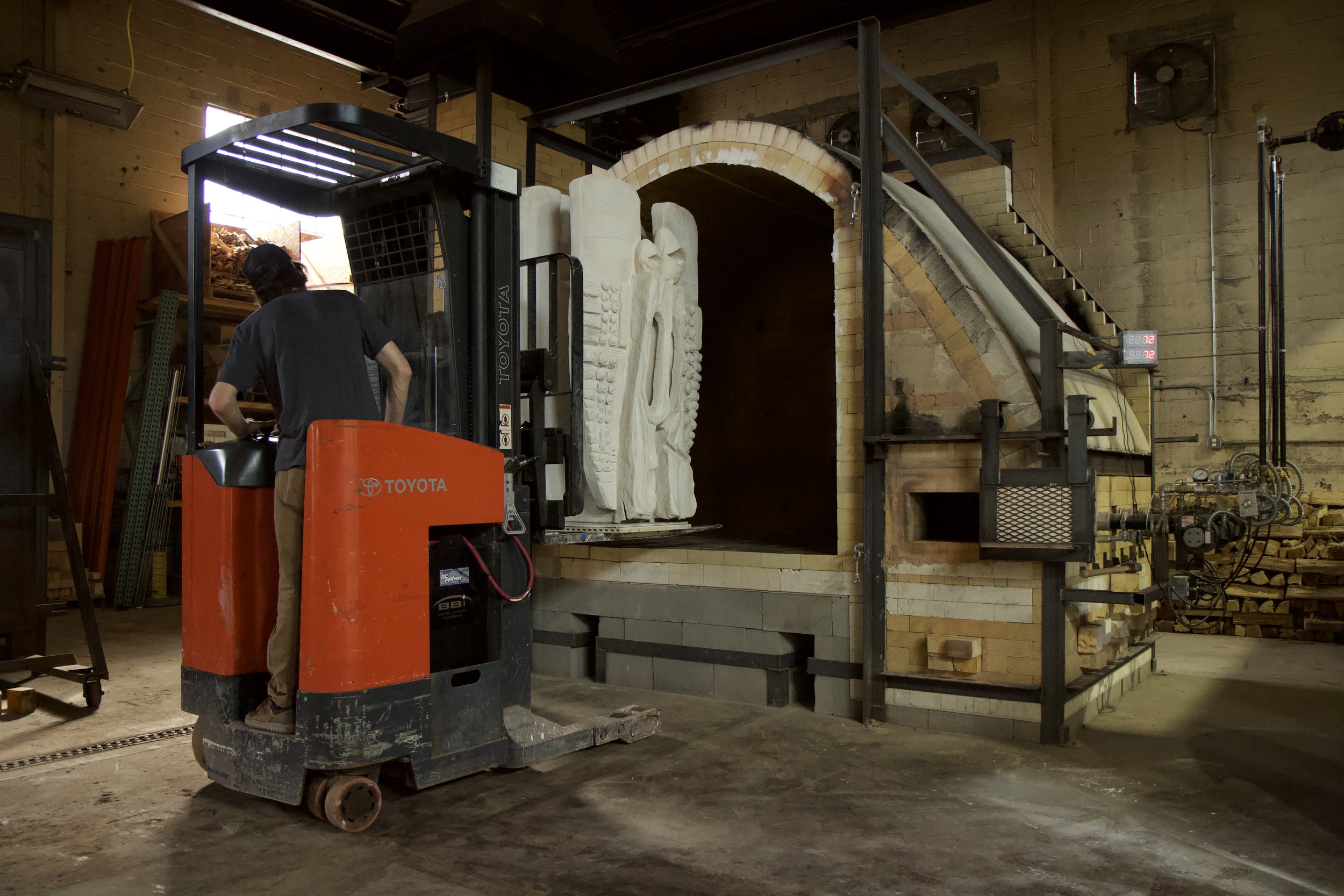 The work is fired in a rare hybrid wood and gas kiln—one of the largest privately owned kilns in the region. Very few artists fire monumental ceramic work in atmospheric conditions like this. For days, temperatures rise beyond 2,000°F as wood, flame, and ash move through the chamber. We guide the heat, but we do not command it.